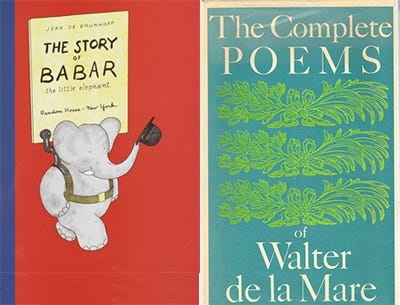 As a kid many of my books came from my Uncle Freddie’s store in Linden, New Jersey. It was called Lin-Wood Fashions, but in addition to ladies’ clothing there was an ever-changing array of other stuff, from bedspreads to microwave ovens to books. That’s where I was exposed to Babar, and the poetry of Walter de la Mare, and all kinds of random stuff. My father would say that most of the stuff in the store “fell off the back of a truck,” but Uncle Freddie probably just bought pallets of remaindered goods.